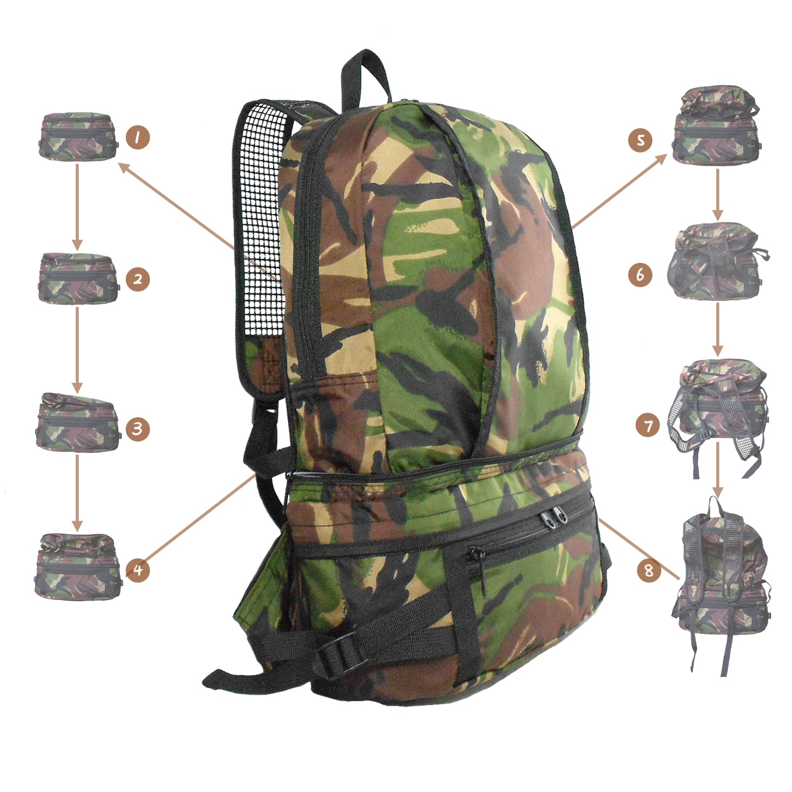 - The upper zipper compartment of the backpack can be folded into the zipper bag on the top of the waist bag