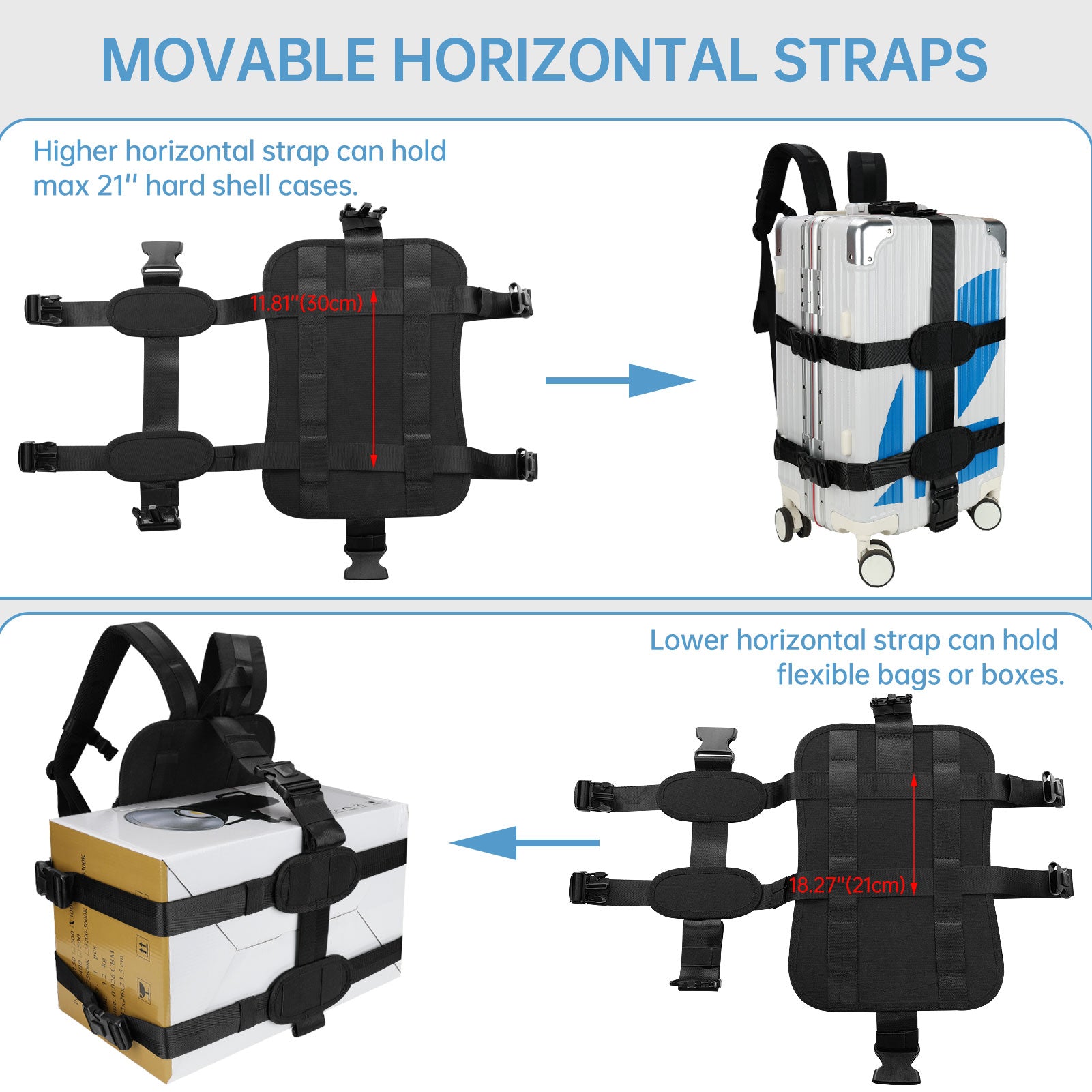 Adjustable strap length enables lower or higher position carrying. Upper horizontal strap can be moved to lower position. And it therefore can hold any medium size hard shell case/baggage.